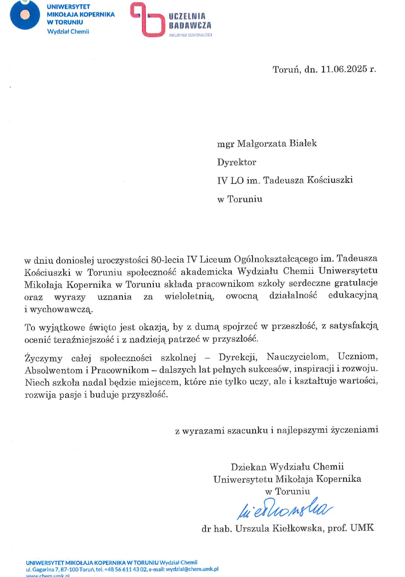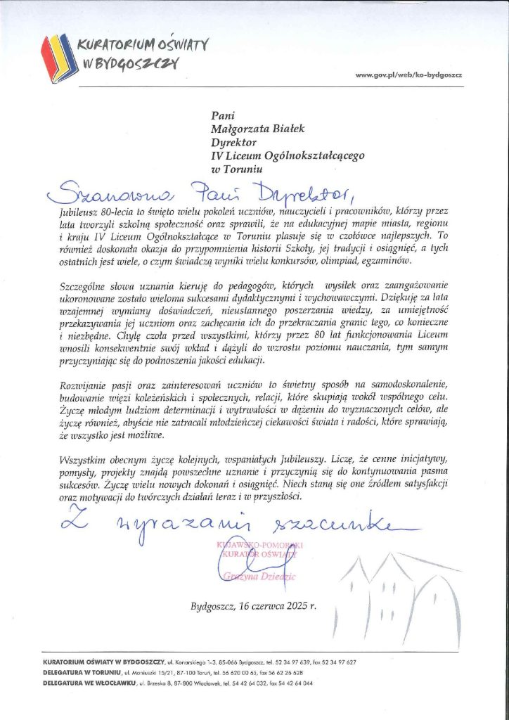 Z okazji wyjątkowego jubileuszu 80-lecia istnienia naszej szkoły, IV Liceum Ogólnokształcącego im. Tadeusza Kościuszki w Toruniu, otrzymaliśmy liczne listy gratulacyjne od instytucji, szkół, uczelni wyższych, władz samorządowych, organizacji społecznych oraz osób prywatnych. Każdy z tych listów to wyraz uznania dla dorobku naszej społeczności, a także inspiracja do dalszej pracy na rzecz edukacji i wychowania kolejnych pokoleń.