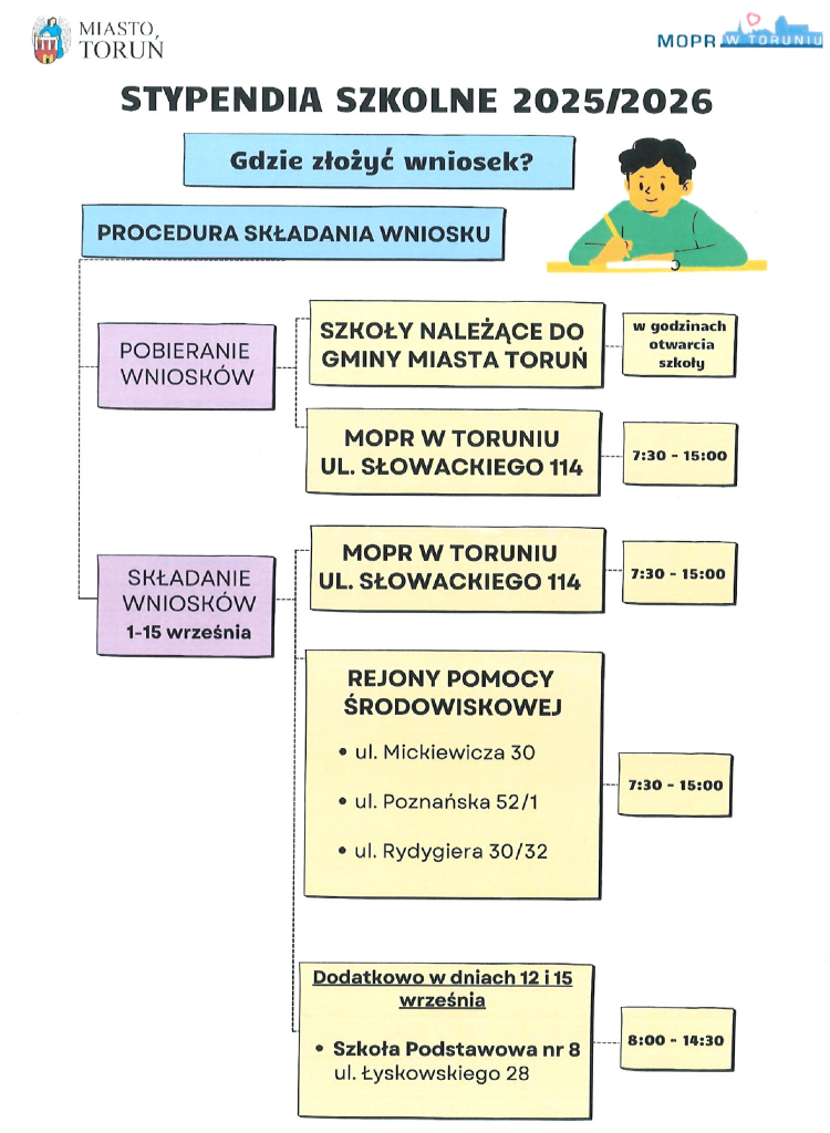 przyznaje się uczniowi na okres nie dłuższy niż od września do grudnia oraz od stycznia do czerwca danego roku szkolnego, a w przypadku słuchaczy na okres nie dłuższy niż od października do grudnia oraz od stycznia do czerwca danego roku szkolnego. Druki wniosków o stypendium będą dostępne w szkołach prowadzonych przez Gminę Miasta Toruń oraz w Miejskim Ośrodku Pomocy Rodzinie w Toruniu przy ul. Słowackiego 114. Wzór wniosku można również pobrać ze strony internetowej: http://www.mopr.torun.pl