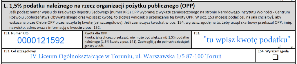 – w rubryce 151 – nr KRS – 0000121592 Toruńskie Stowarzyszenie Pomocy Szkole,