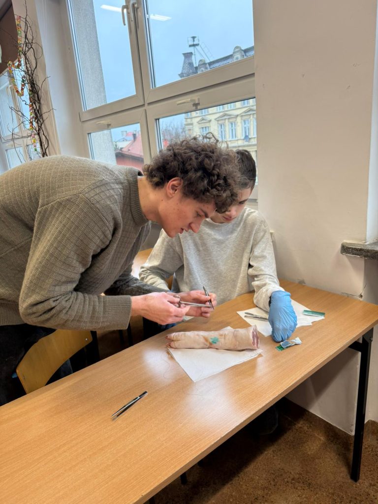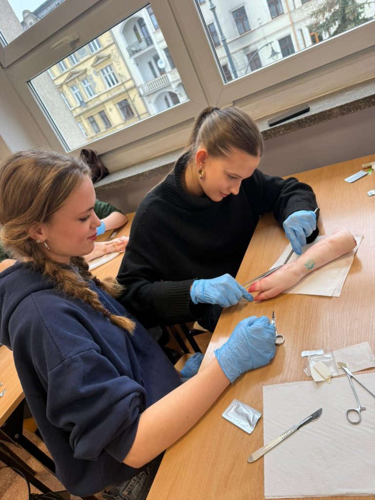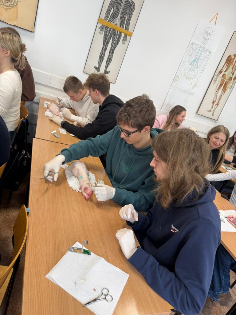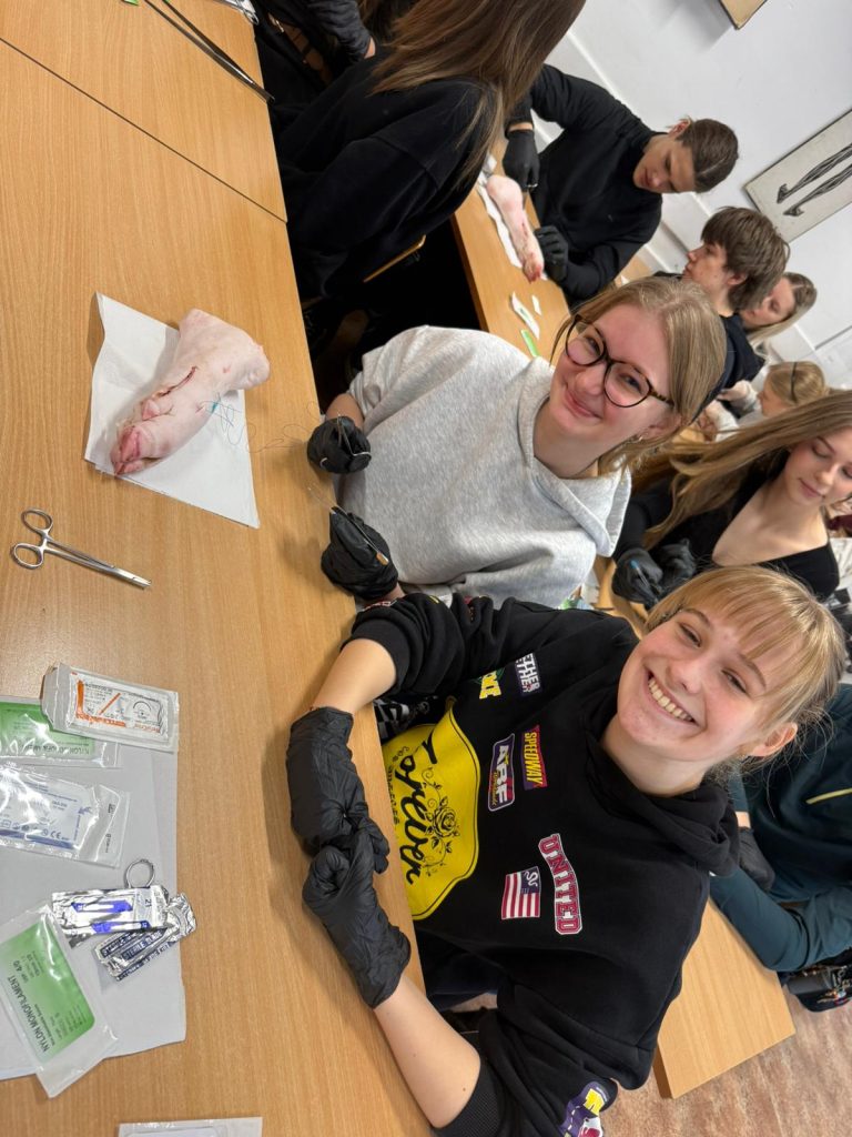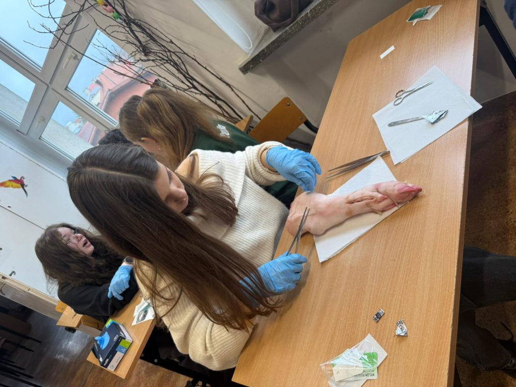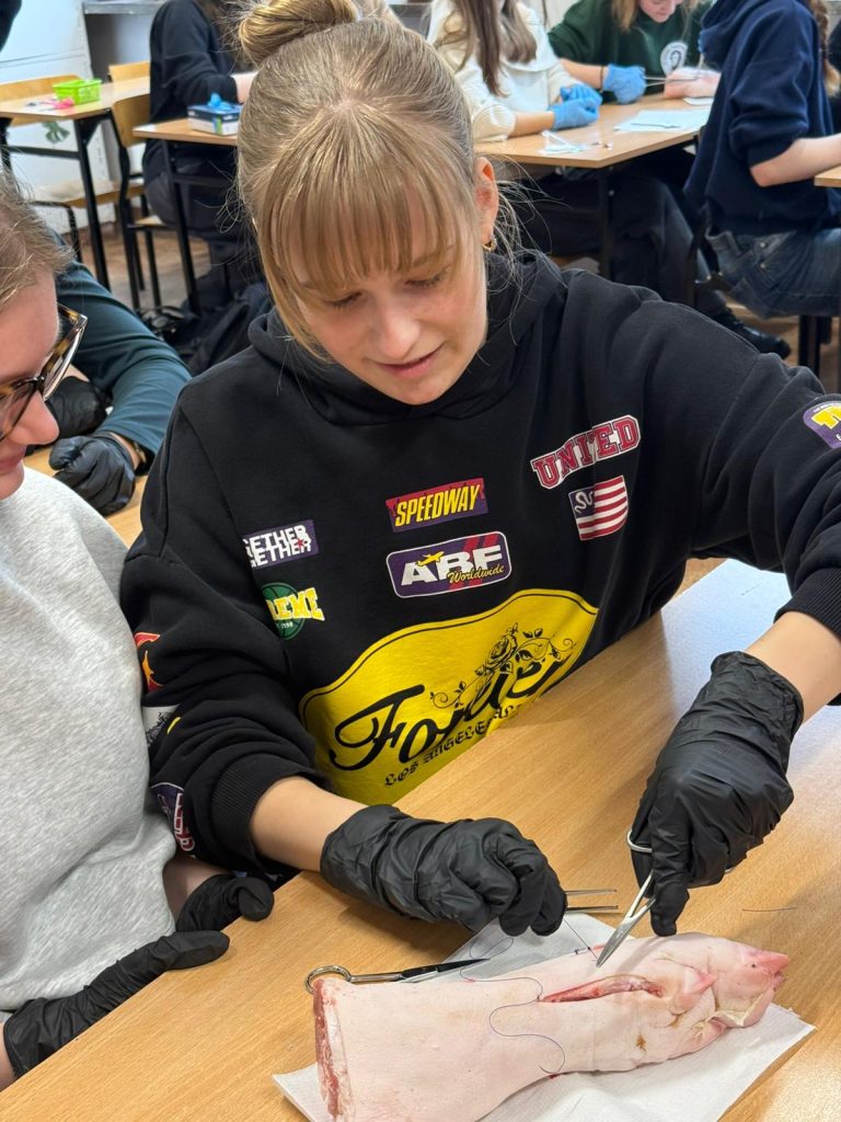 Uczniowie klasy 3Ag i 3Af wraz z prof. Marleną Zielińską mieli ogromną przyjemność gościć naszych absolwentów i obecnych studentów kierunków lekarskich: Jakuba Rogozińskiego z Wydziału Medycznego Politechniki Bydgoskiej oraz Kamila Szymańskiego z Gdańskiego Uniwersytetu Medycznego. Podczas poprowadzonych przez nich warsztatów nasi uczniowie poznali najpowszechniejsze techniki szycia chirurgicznego i ich zastosowanie, dowiedzieli się o różnych rodzajach używanych do tego nici, a co najważniejsze sprawdzili nowo zdobytą wiedzę w praktyce – nauczyli się zakładania klasycznego szwu pojedynczego węzełkowego. Umiejętności doskonalili na skórze nóżek wieprzowych, która jest uważana za najbardziej zbliżoną do ludzkiej pod względem budowy i właściwości. Nauczyli się również jak ściągać szwy.