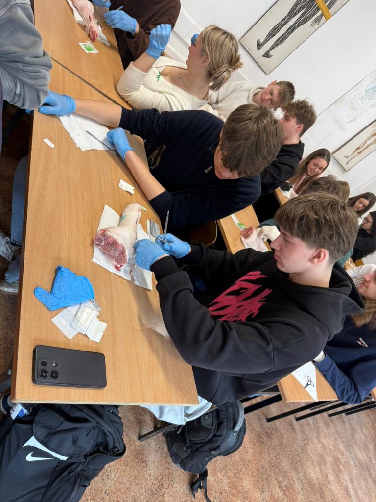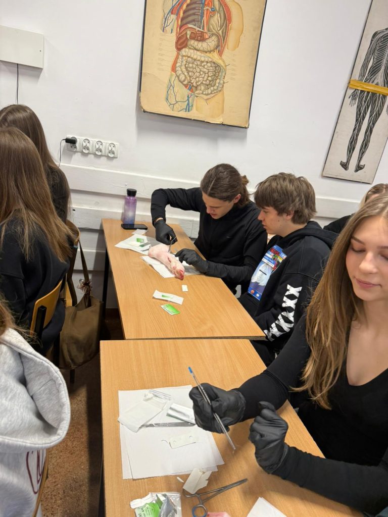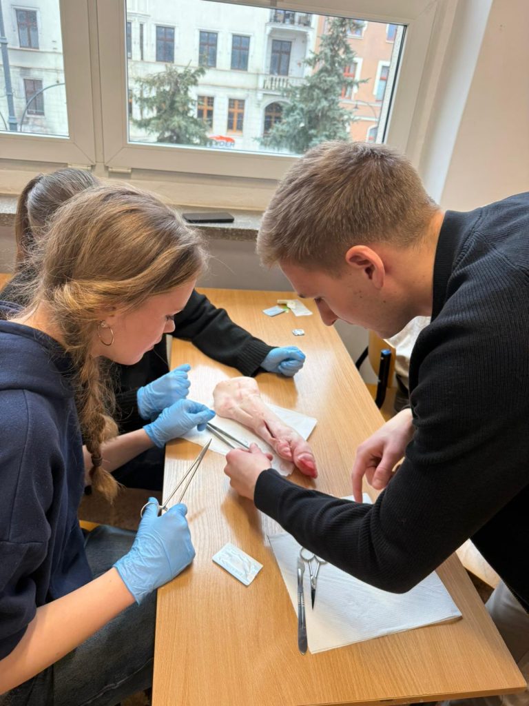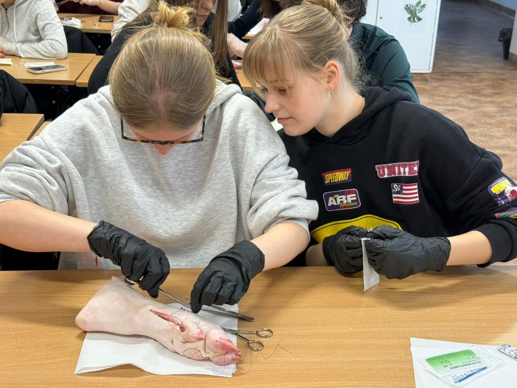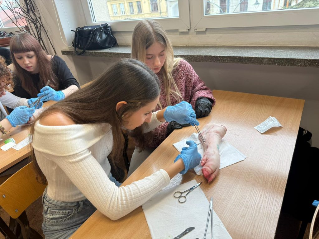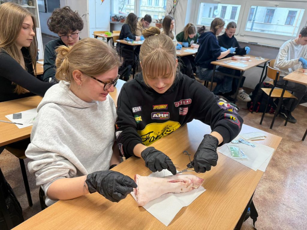 Uczniowie klasy 3Ag i 3Af wraz z prof. Marleną Zielińską mieli ogromną przyjemność gościć naszych absolwentów i obecnych studentów kierunków lekarskich: Jakuba Rogozińskiego z Wydziału Medycznego Politechniki Bydgoskiej oraz Kamila Szymańskiego z Gdańskiego Uniwersytetu Medycznego. Podczas poprowadzonych przez nich warsztatów nasi uczniowie poznali najpowszechniejsze techniki szycia chirurgicznego i ich zastosowanie, dowiedzieli się o różnych rodzajach używanych do tego nici, a co najważniejsze sprawdzili nowo zdobytą wiedzę w praktyce – nauczyli się zakładania klasycznego szwu pojedynczego węzełkowego. Umiejętności doskonalili na skórze nóżek wieprzowych, która jest uważana za najbardziej zbliżoną do ludzkiej pod względem budowy i właściwości. Nauczyli się również jak ściągać szwy.