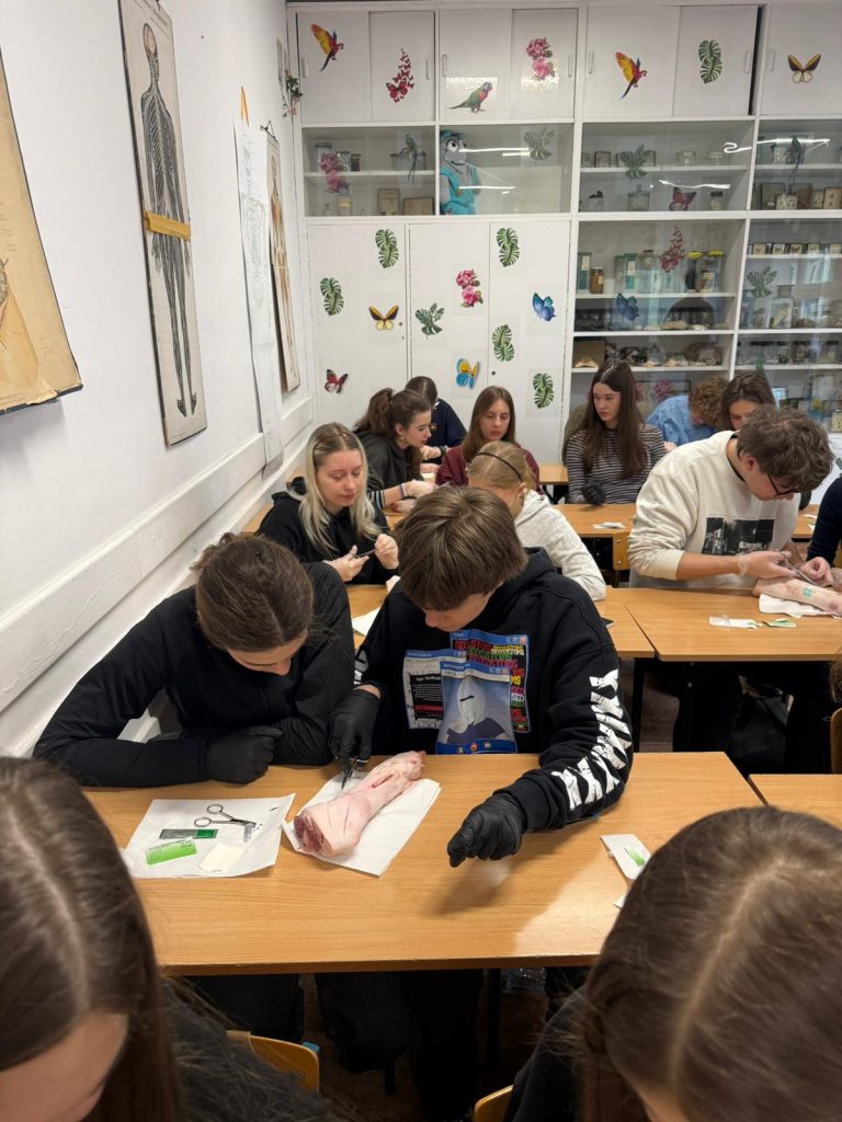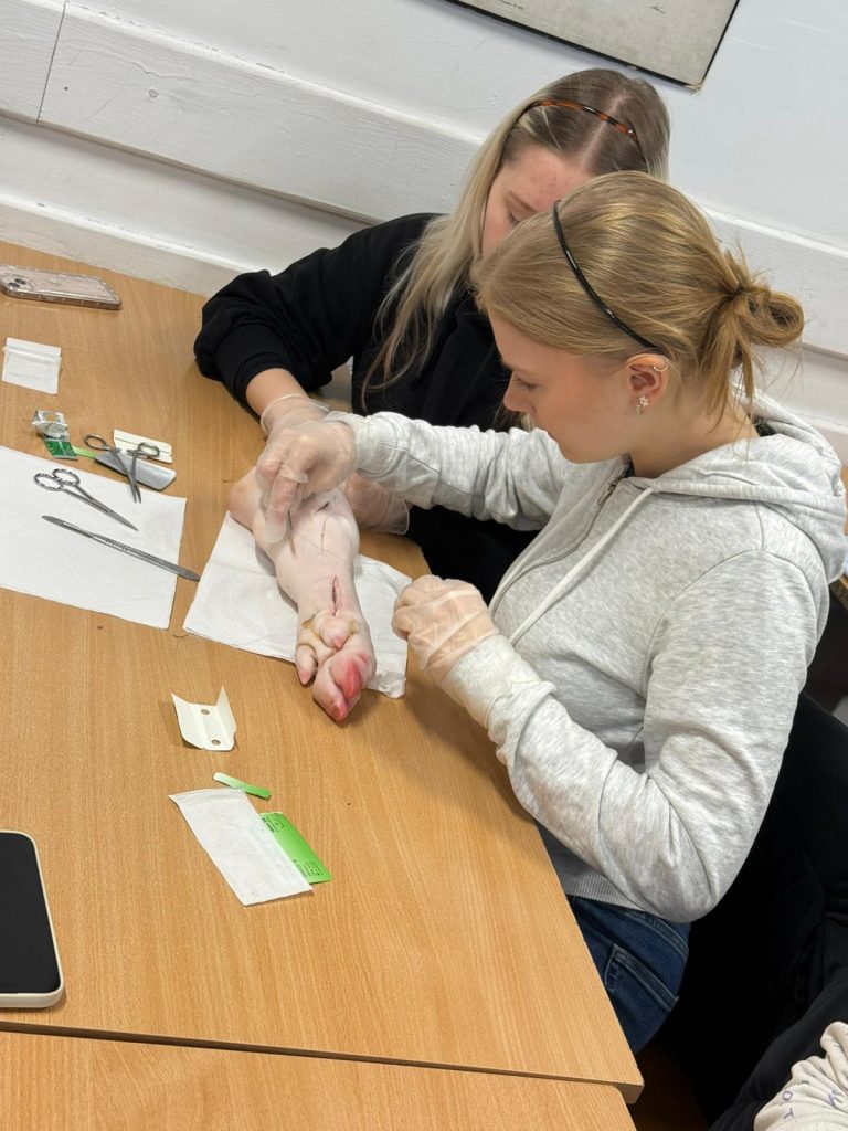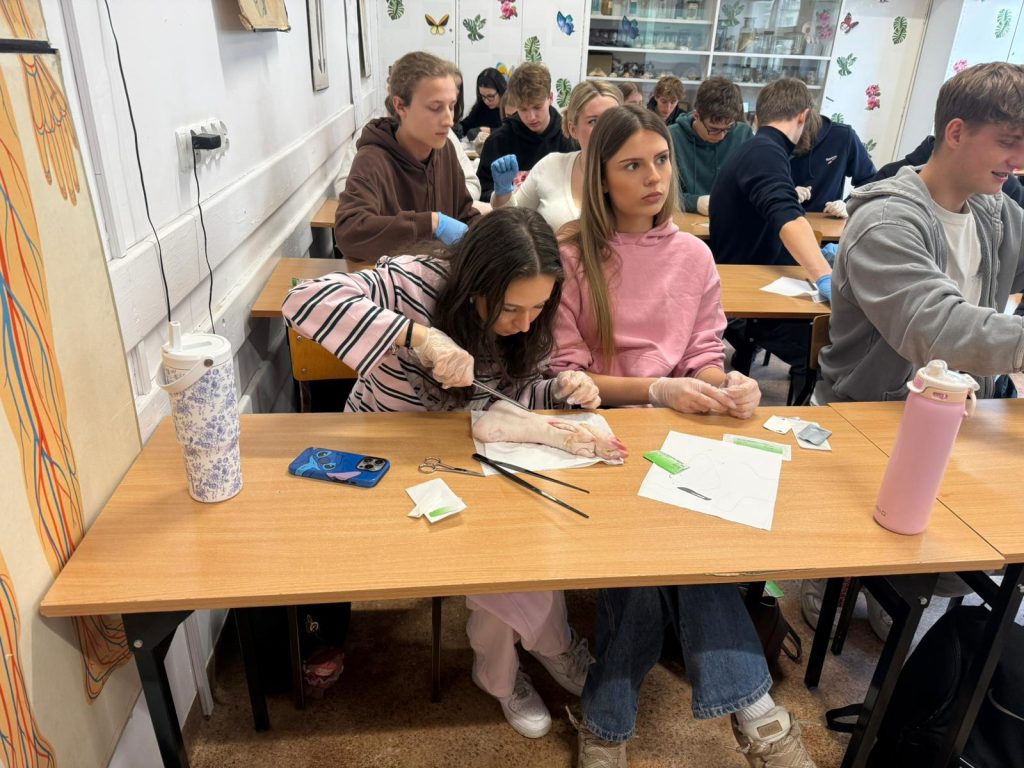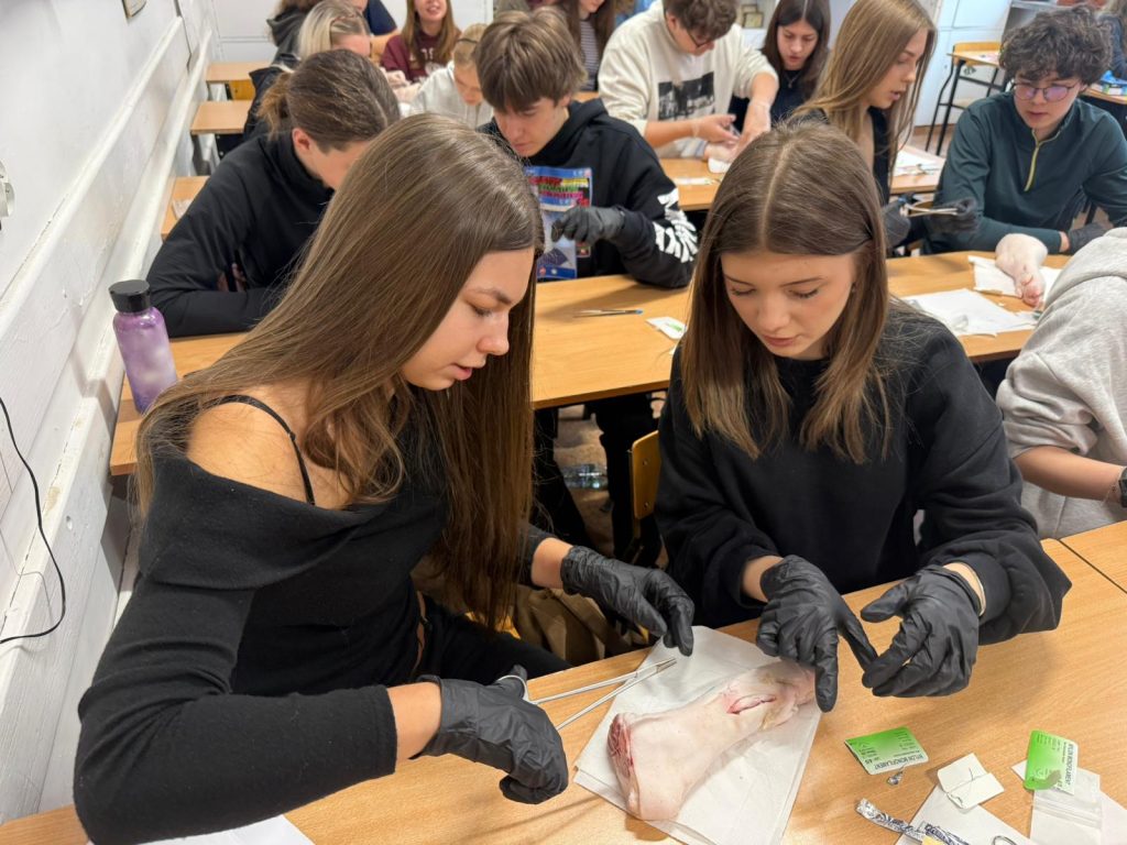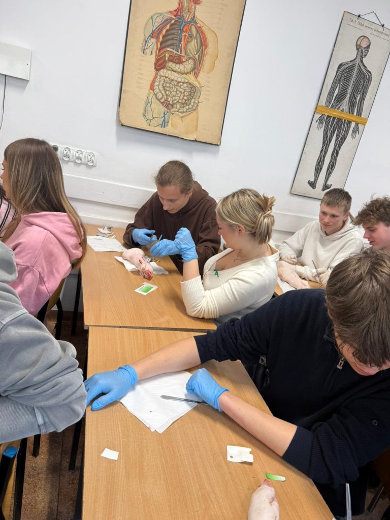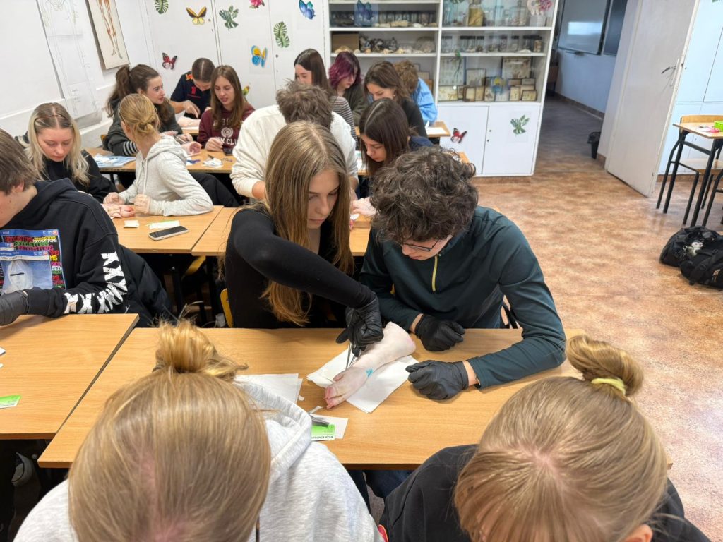 Uczniowie klasy 3Ag i 3Af wraz z prof. Marleną Zielińską mieli ogromną przyjemność gościć naszych absolwentów i obecnych studentów kierunków lekarskich: Jakuba Rogozińskiego z Wydziału Medycznego Politechniki Bydgoskiej oraz Kamila Szymańskiego z Gdańskiego Uniwersytetu Medycznego. Podczas poprowadzonych przez nich warsztatów nasi uczniowie poznali najpowszechniejsze techniki szycia chirurgicznego i ich zastosowanie, dowiedzieli się o różnych rodzajach używanych do tego nici, a co najważniejsze sprawdzili nowo zdobytą wiedzę w praktyce – nauczyli się zakładania klasycznego szwu pojedynczego węzełkowego. Umiejętności doskonalili na skórze nóżek wieprzowych, która jest uważana za najbardziej zbliżoną do ludzkiej pod względem budowy i właściwości. Nauczyli się również jak ściągać szwy.