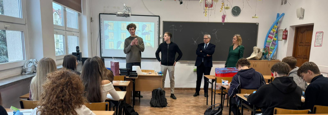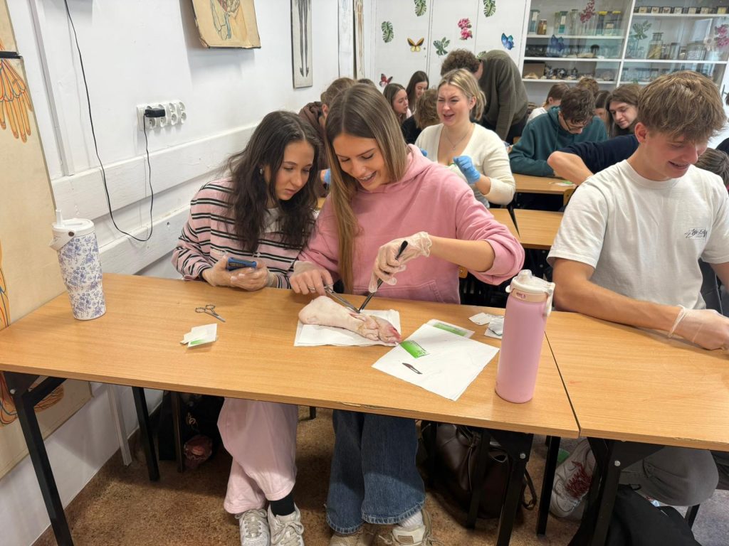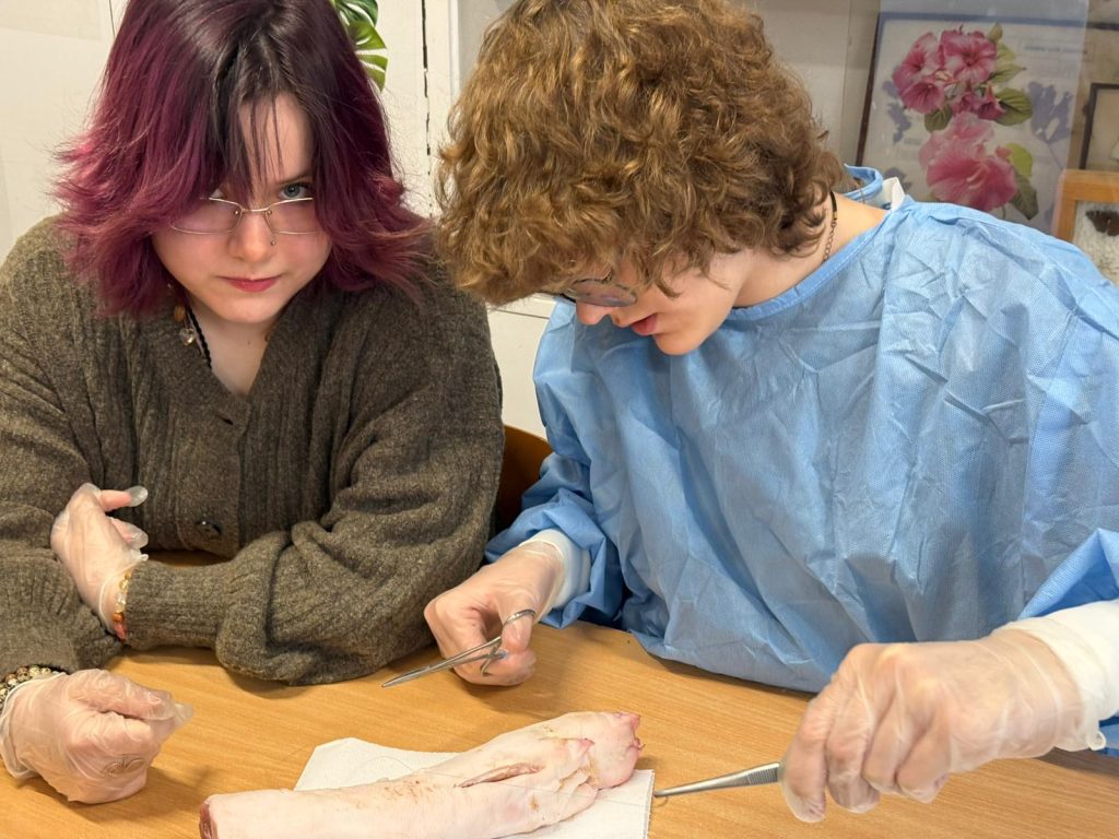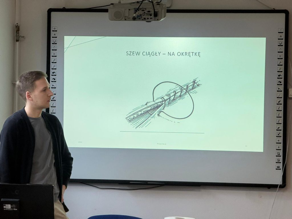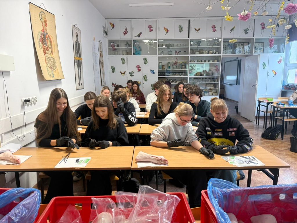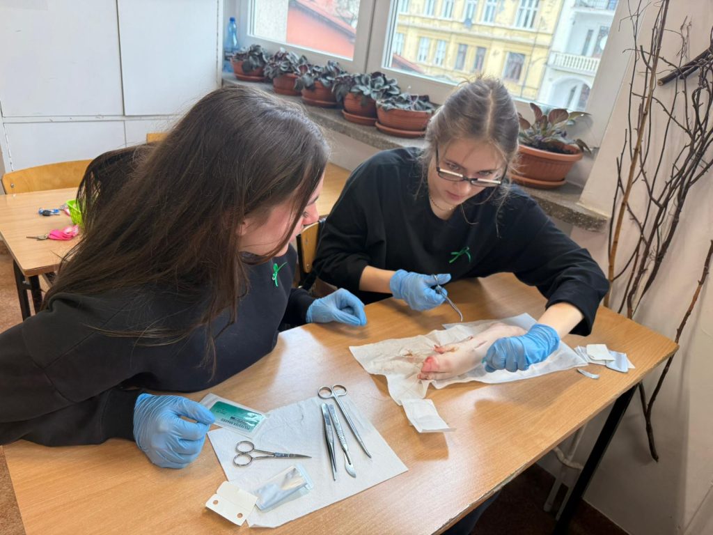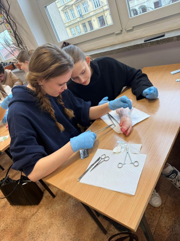 Uczniowie klasy 3Ag i 3Af wraz z prof. Marleną Zielińską mieli ogromną przyjemność gościć naszych absolwentów i obecnych studentów kierunków lekarskich: Jakuba Rogozińskiego z Wydziału Medycznego Politechniki Bydgoskiej oraz Kamila Szymańskiego z Gdańskiego Uniwersytetu Medycznego. Podczas poprowadzonych przez nich warsztatów nasi uczniowie poznali najpowszechniejsze techniki szycia chirurgicznego i ich zastosowanie, dowiedzieli się o różnych rodzajach używanych do tego nici, a co najważniejsze sprawdzili nowo zdobytą wiedzę w praktyce – nauczyli się zakładania klasycznego szwu pojedynczego węzełkowego. Umiejętności doskonalili na skórze nóżek wieprzowych, która jest uważana za najbardziej zbliżoną do ludzkiej pod względem budowy i właściwości. Nauczyli się również jak ściągać szwy.